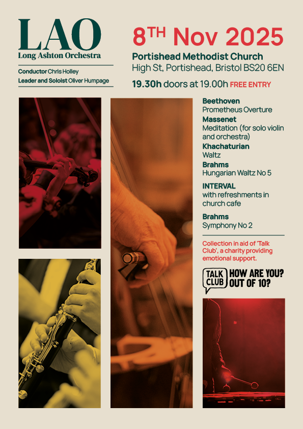 See details >>Long Ashton Orchestra returns to Portishead Methodist Church, under our new conductor Chris Holley. This is a dramatic programme of music, with a selection of some very contrasting pieces in the first half of the concert – from Beethoven to a contemporary piece by Campkin.
